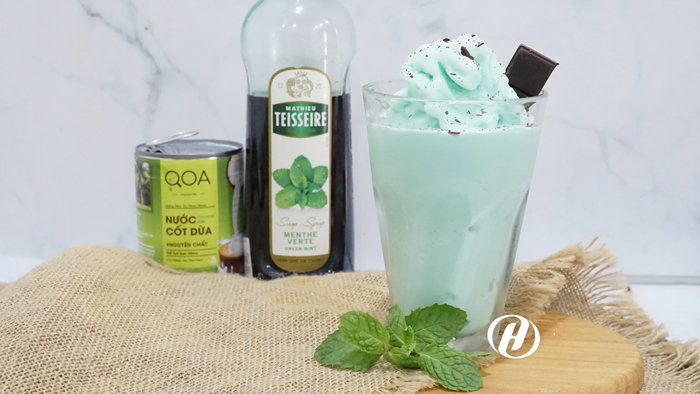 Xay nhuyễn nguyên liệu cùng với đá và đổ ra ly trang trí bằng socola, lá bạc hà tươi.